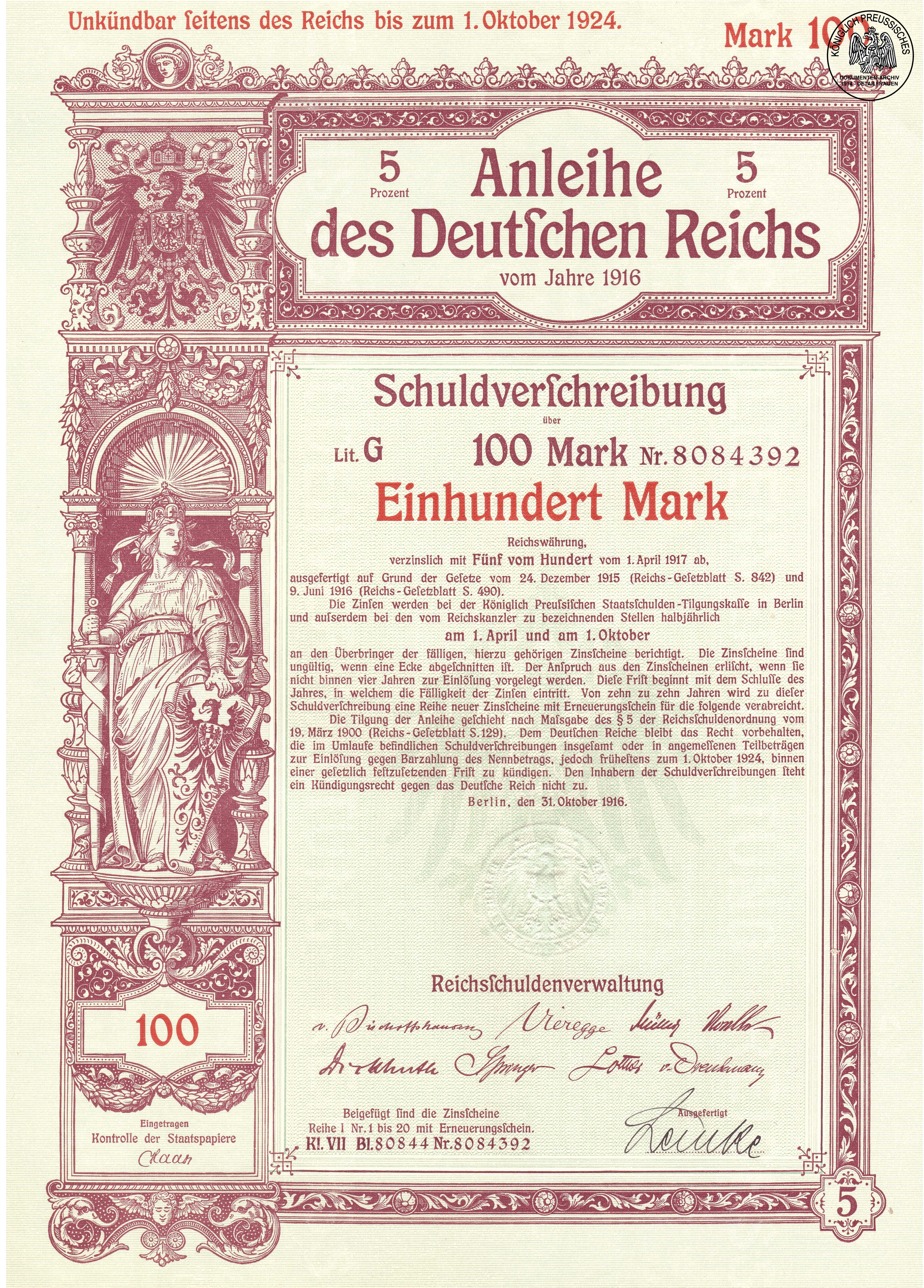 Anleihe des Deutschen Reiches vom 31. Oktober 1916 im Wert zu 100M;