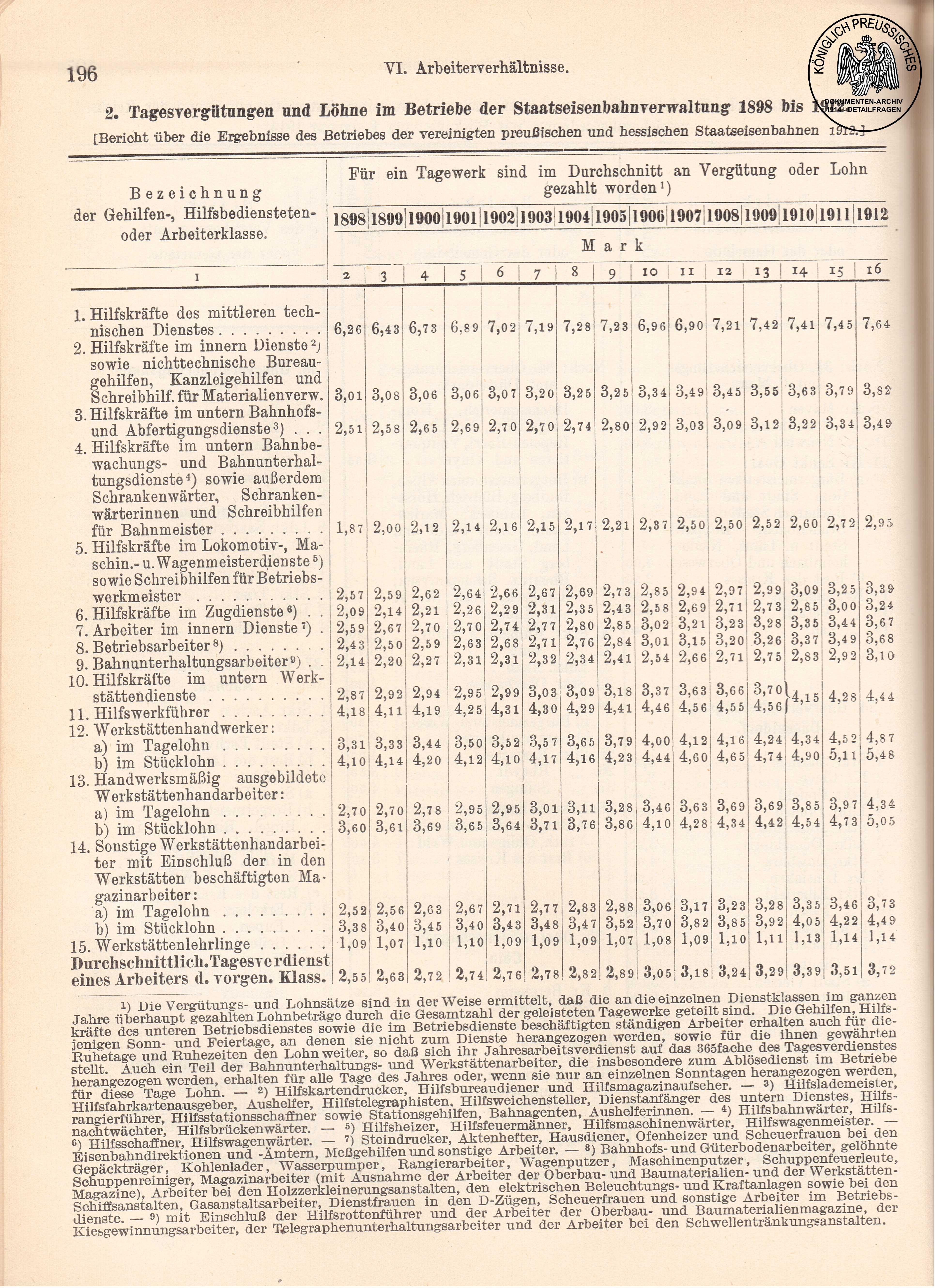 Arbeitslöhne bei der staatlichen Eisenbahn.Berichtszeitraum 1898 - 1912 |