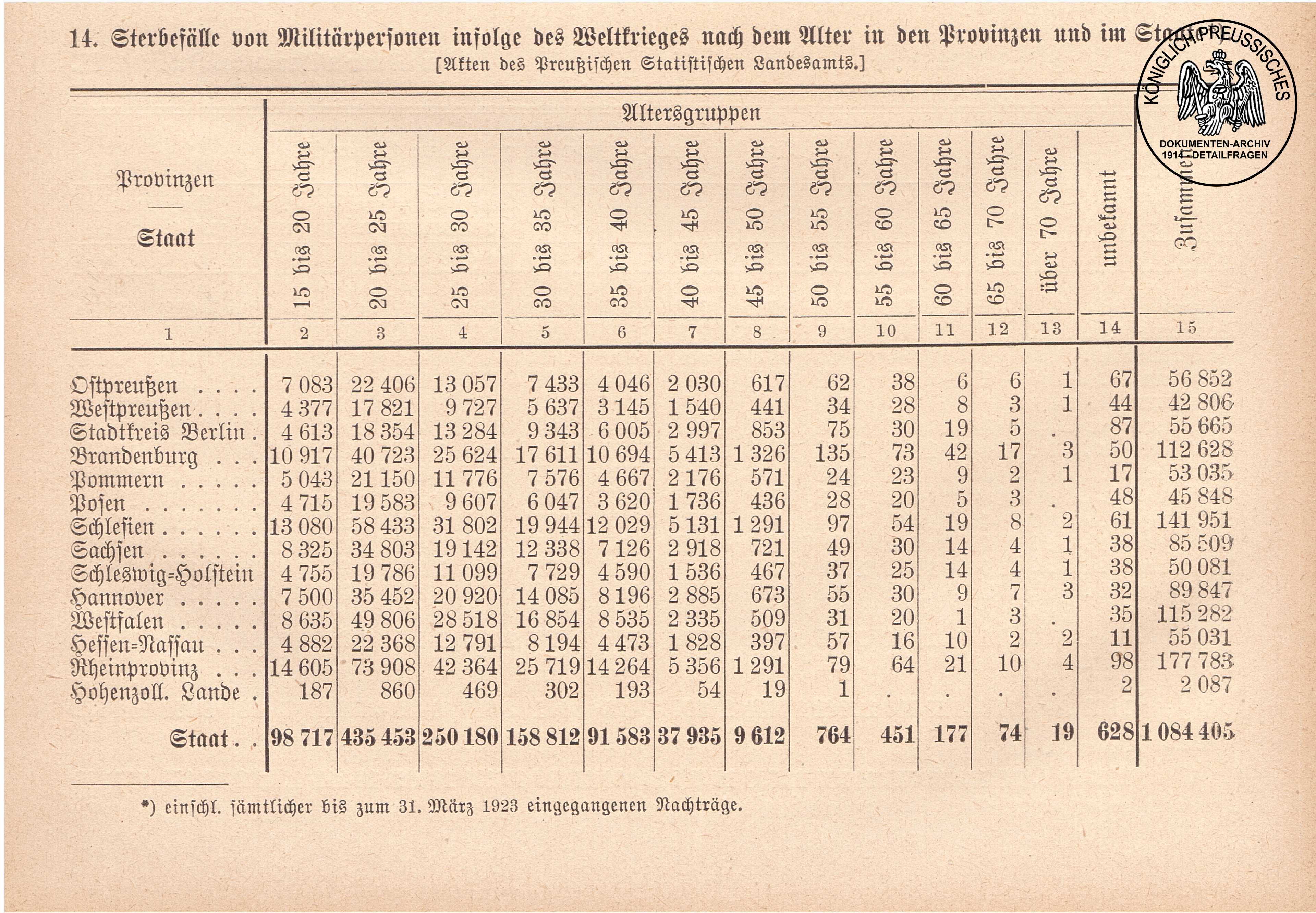 Sterbefälle von Militärpersonen infolge des Weltkriegesnach dem Alter in den Provinzen und im Staate (Preussen);einschl. sämtlicher bis zum 31.03.1923 eingegangenen Nachträge.Berichtszeitraum 1914 - 1918 |