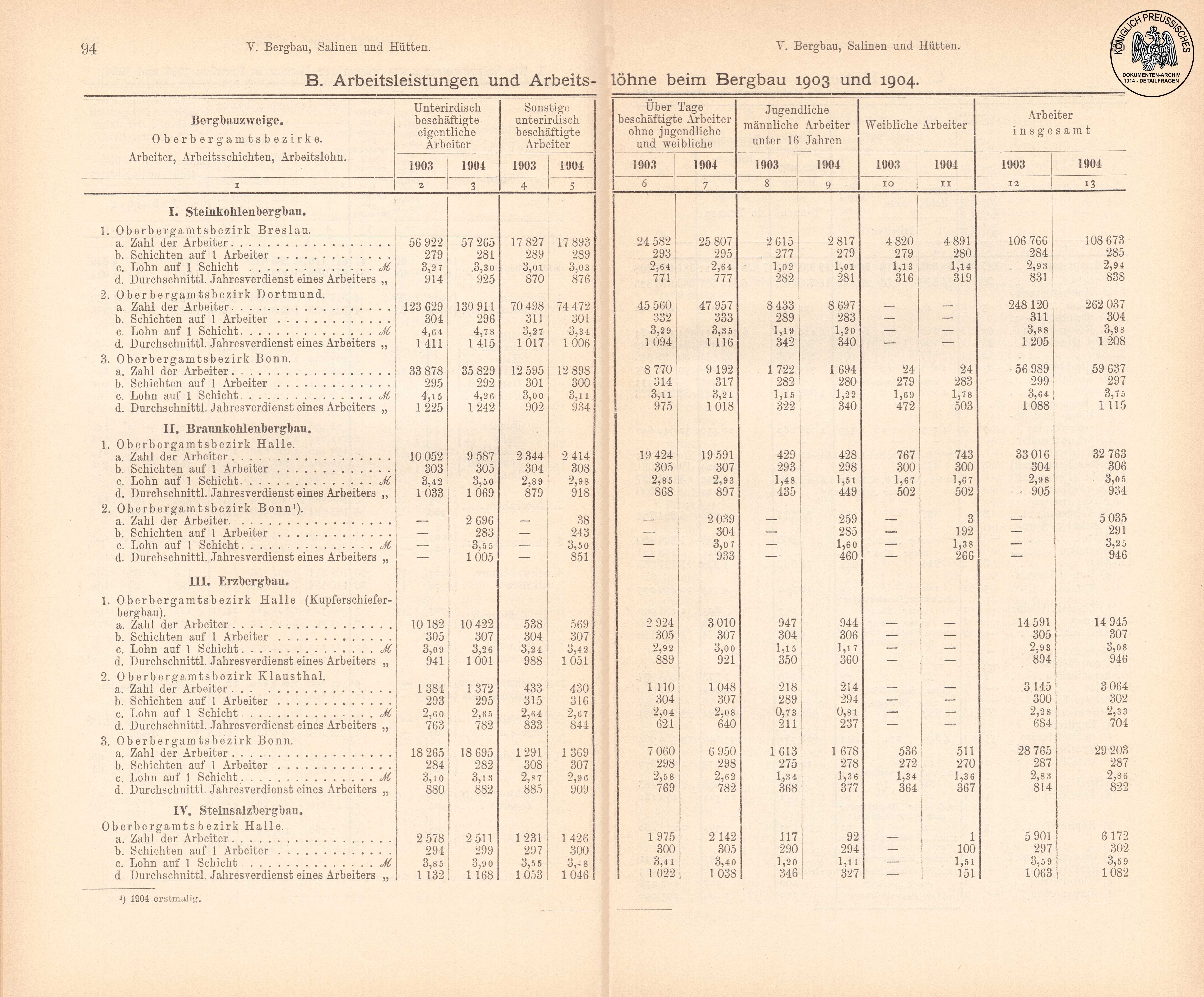 Arbeitslöhne und Arbeitszeiten im BergbauBerichtszeitraum 1903 - 1904 |