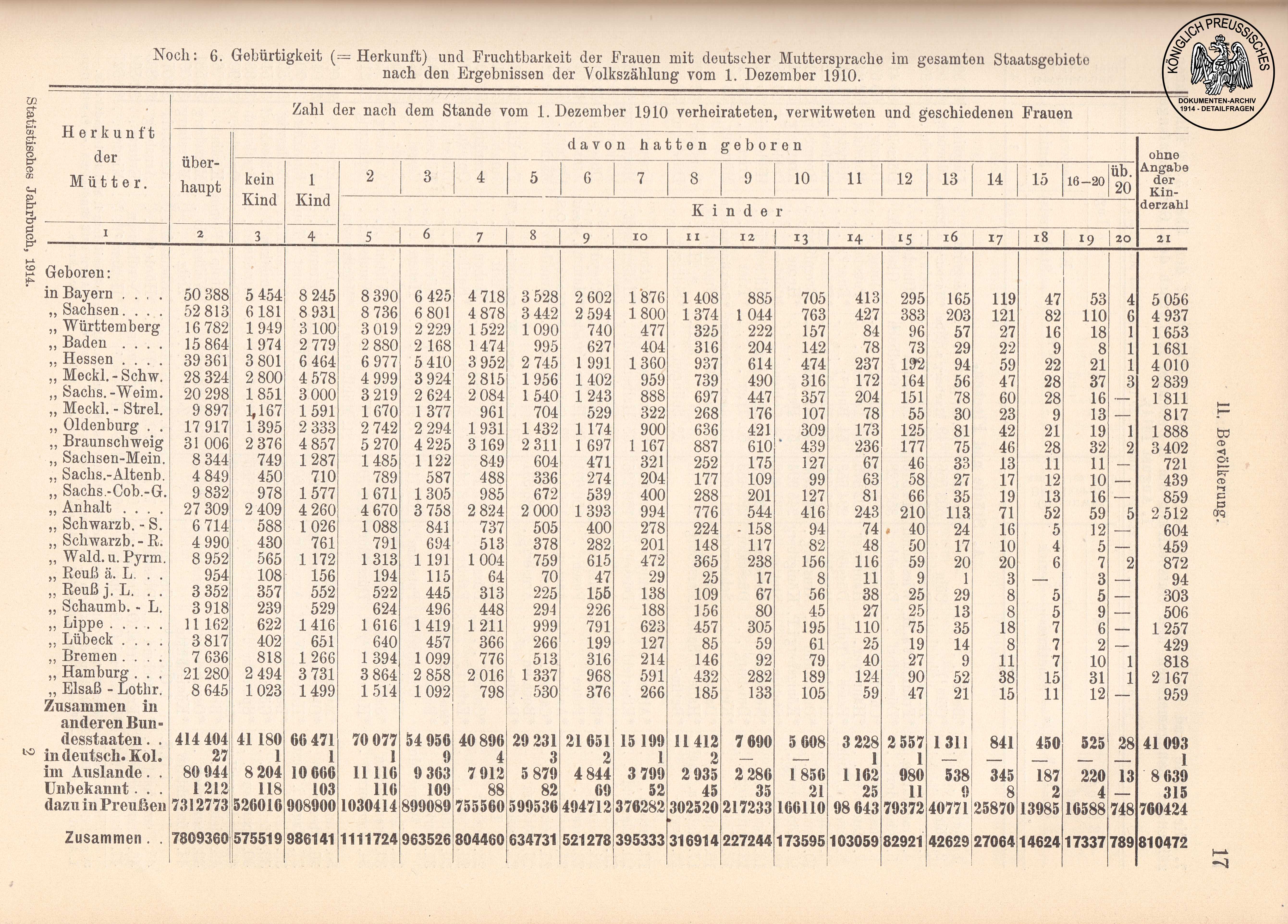Herkunft und Fruchtbarkeit der Frauen deutscher Muttersprache imgesamten Staatsgebiet nach den Ergebnissen derVolkszählung von 1910Berichtszeitraum 1910/1913 |