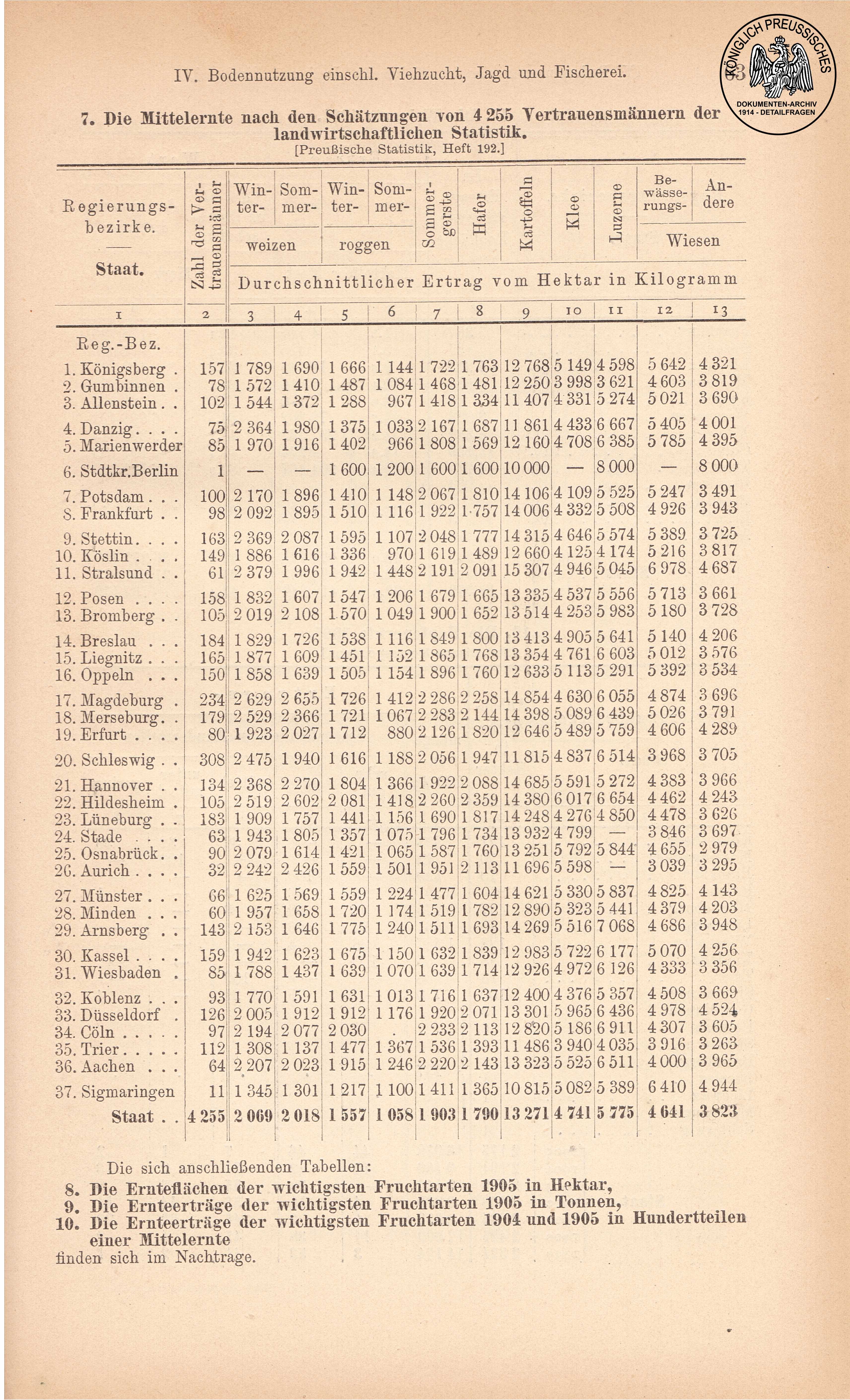 Schätzung der Mittel- (=Normal-) Ernte im Durchschnitt der Jahre 1904 und 1915;die Schätzungen basieren auf den Angaben von 4255 Vertrauensmännern.Erhebungszeitraum 1904 - 1905Detailzahlen zum Ernteertrag. |