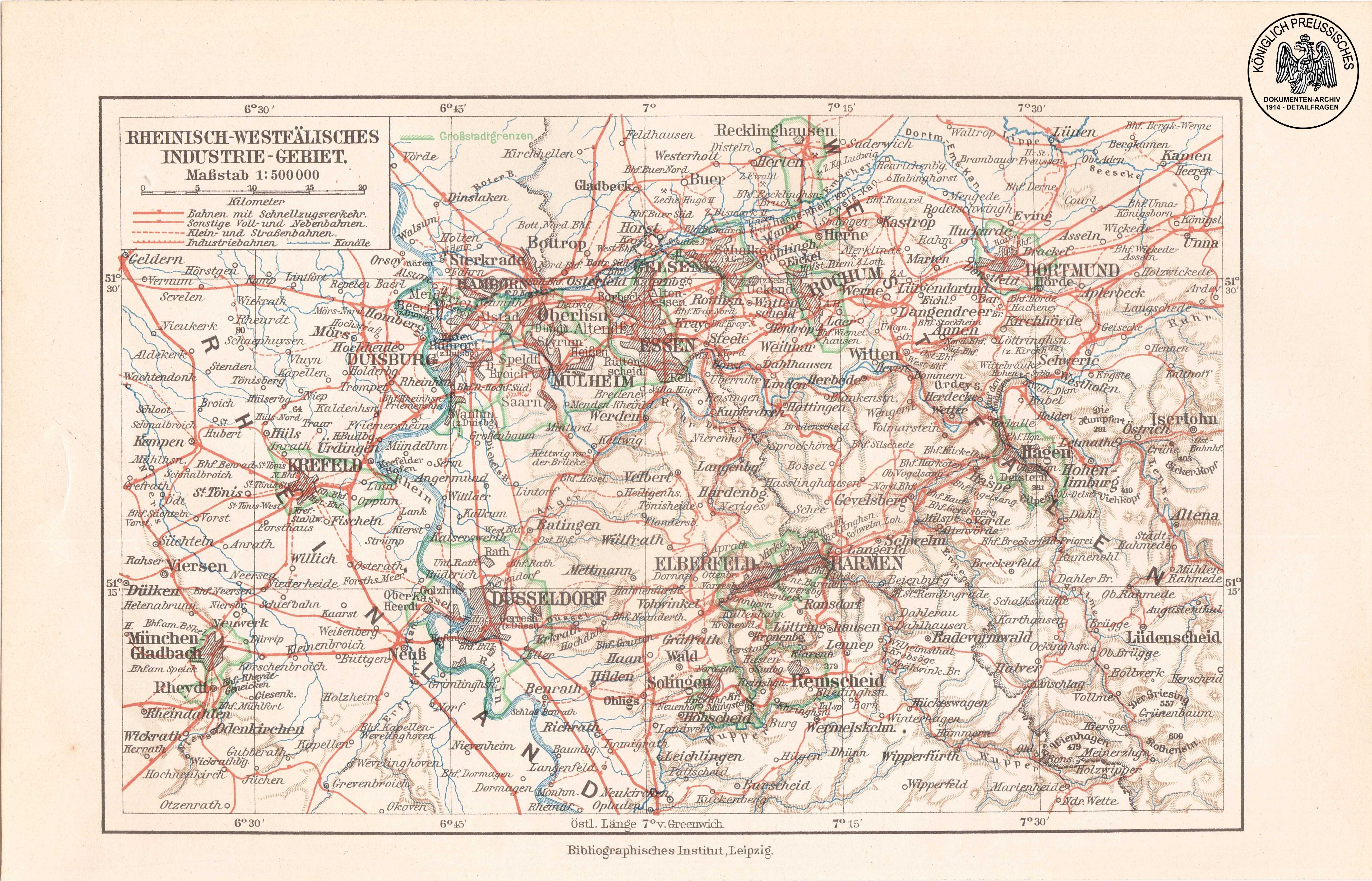 Karte des rheinisch-Westfaelischen Industriegebietes, inclusive der Bahnlinien
