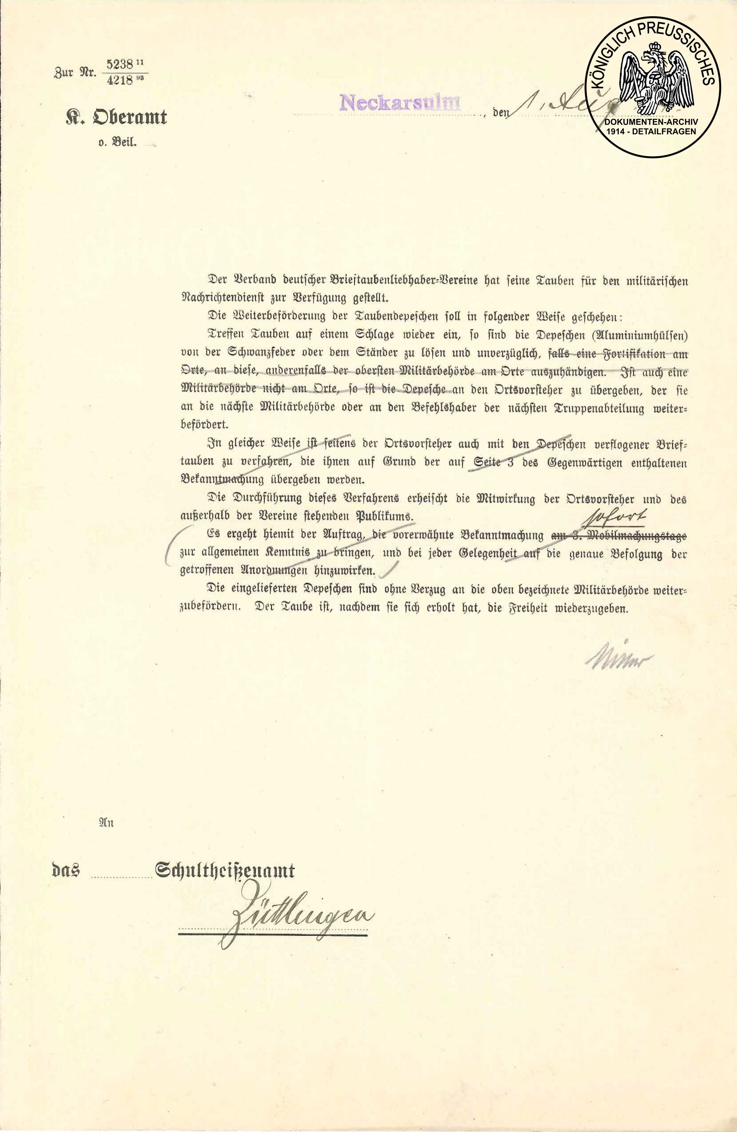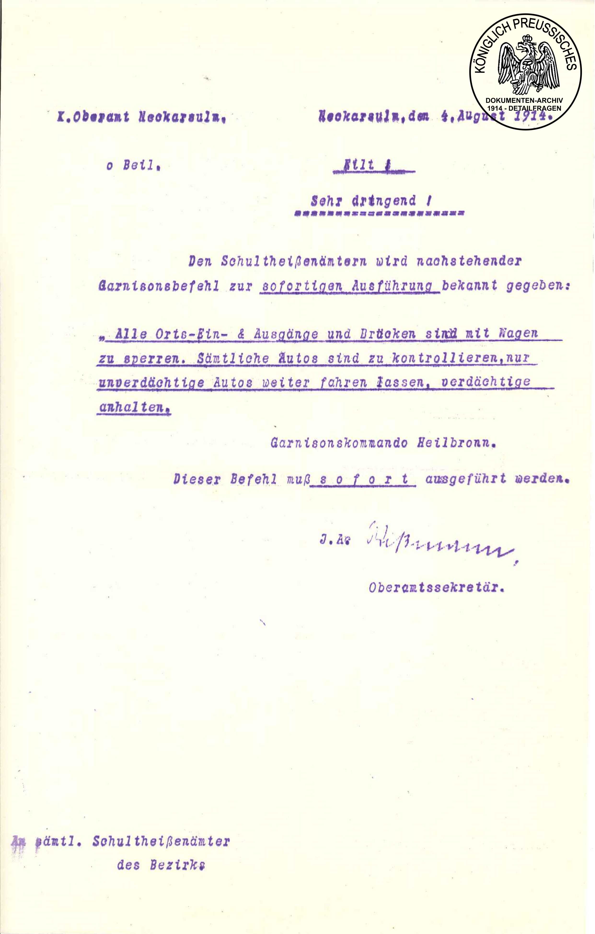 Erlaß des Ministeriums des Inneren des Königreichs Württemberg über die Verbreitung des Mobilmachungsbefehls an die unter- geordneten Verwaltungen. Der Erlaß regelt in welcher Weise die Ämter an der Verbreitung des Mobilmachungsbefehles mitzuwirken haben und welchen Vorkehrungen zu treffen sind. Quelle: Gemeindearchiv Züttlingen |