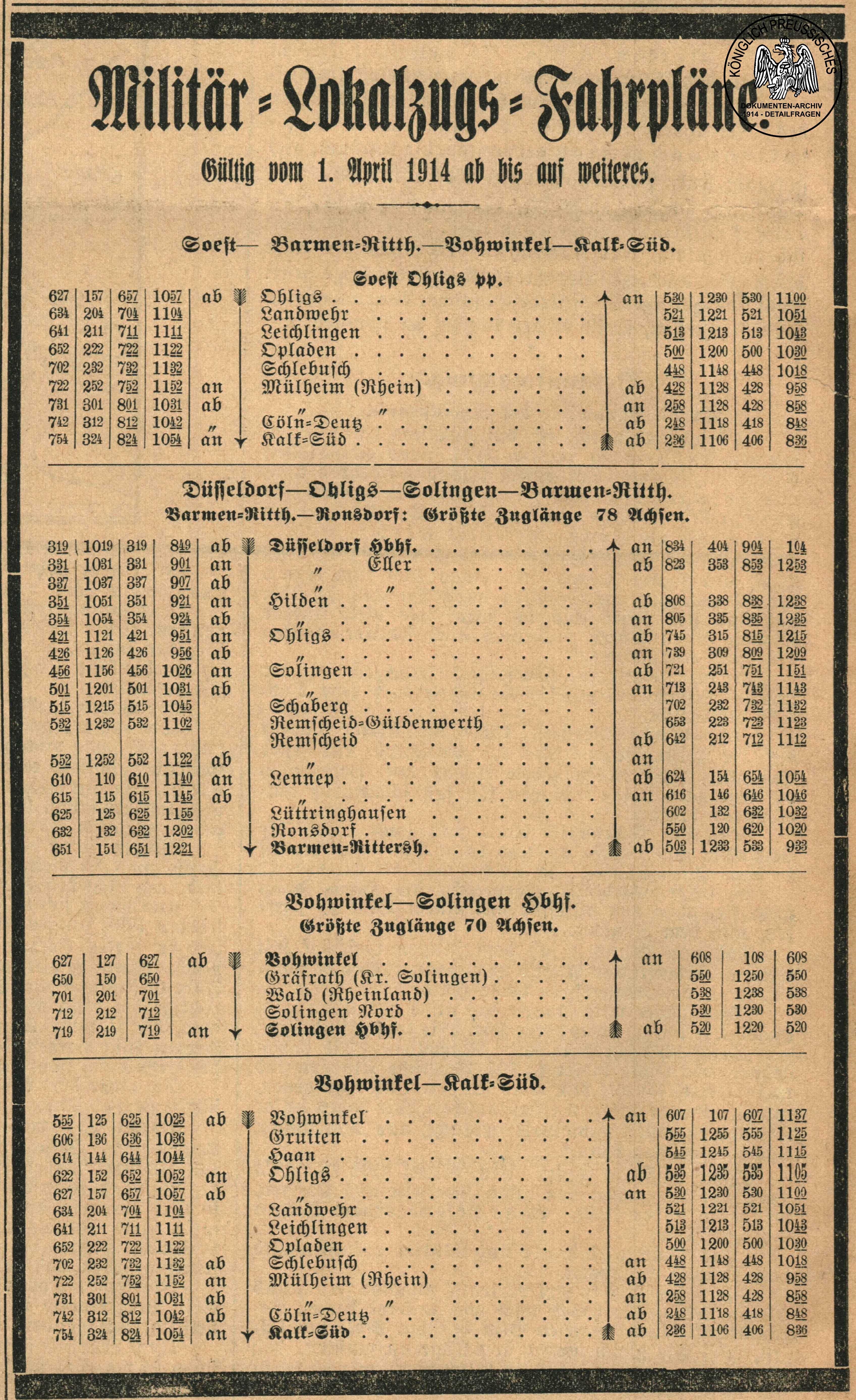 Lokalzugfahrplan, der mit der Mobilmachung den "Friedens-" fahrplan im Bereich Solingen ersetzt. Interessant ist, daß dieser Fahrplan ab dem 1. April in Kraft tritt. Dies ist wahrscheinlich analog zur Gültigkeit der Kriegs- beorderungen (01.04-31.03). Dieser Fahrplan wurde in der Solinger Zeitung veröffentlicht. |