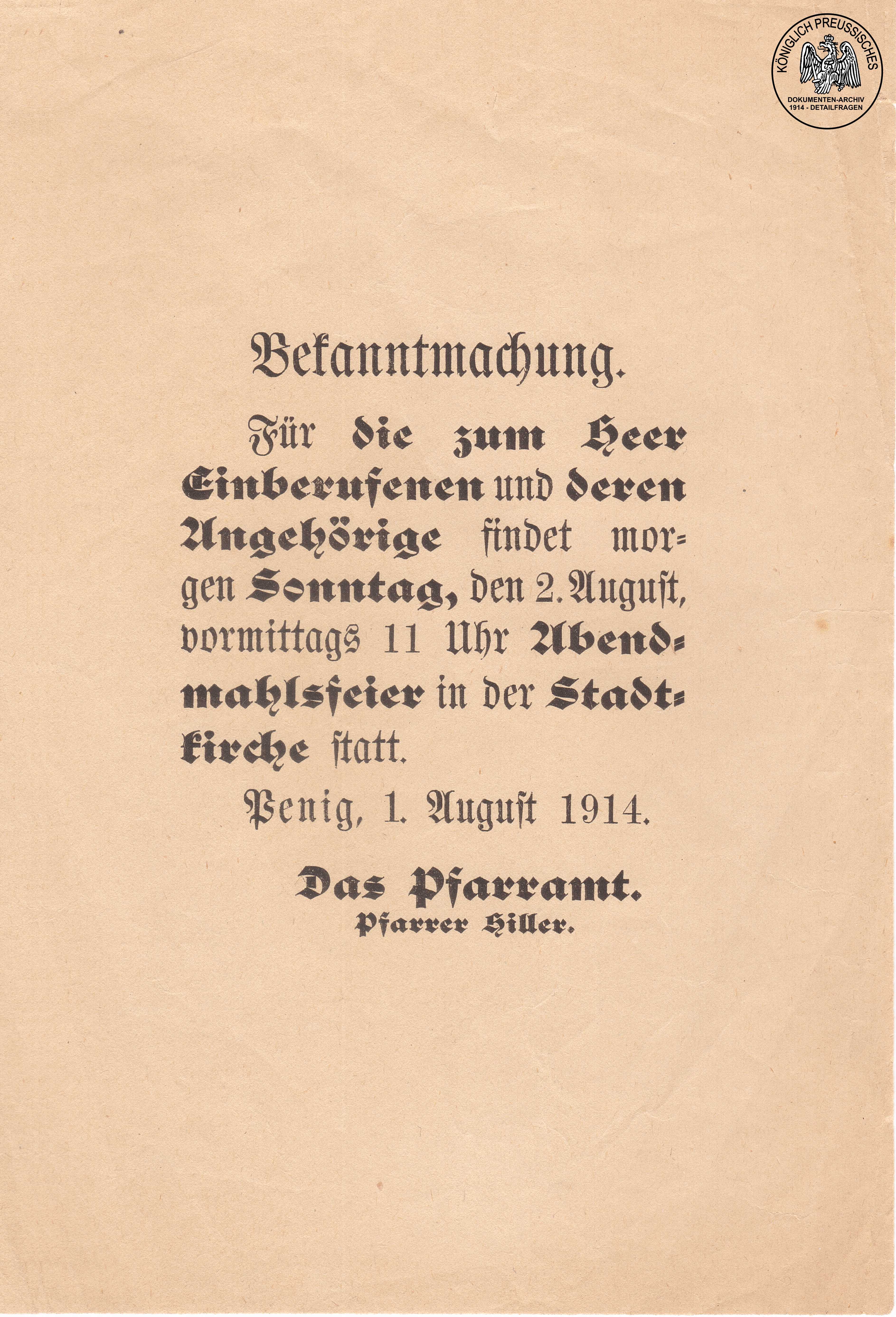 Bekanntmachung bzgl. eines Gottesdienstes für die zum Kriegsdienst eingezogenen Männer. |