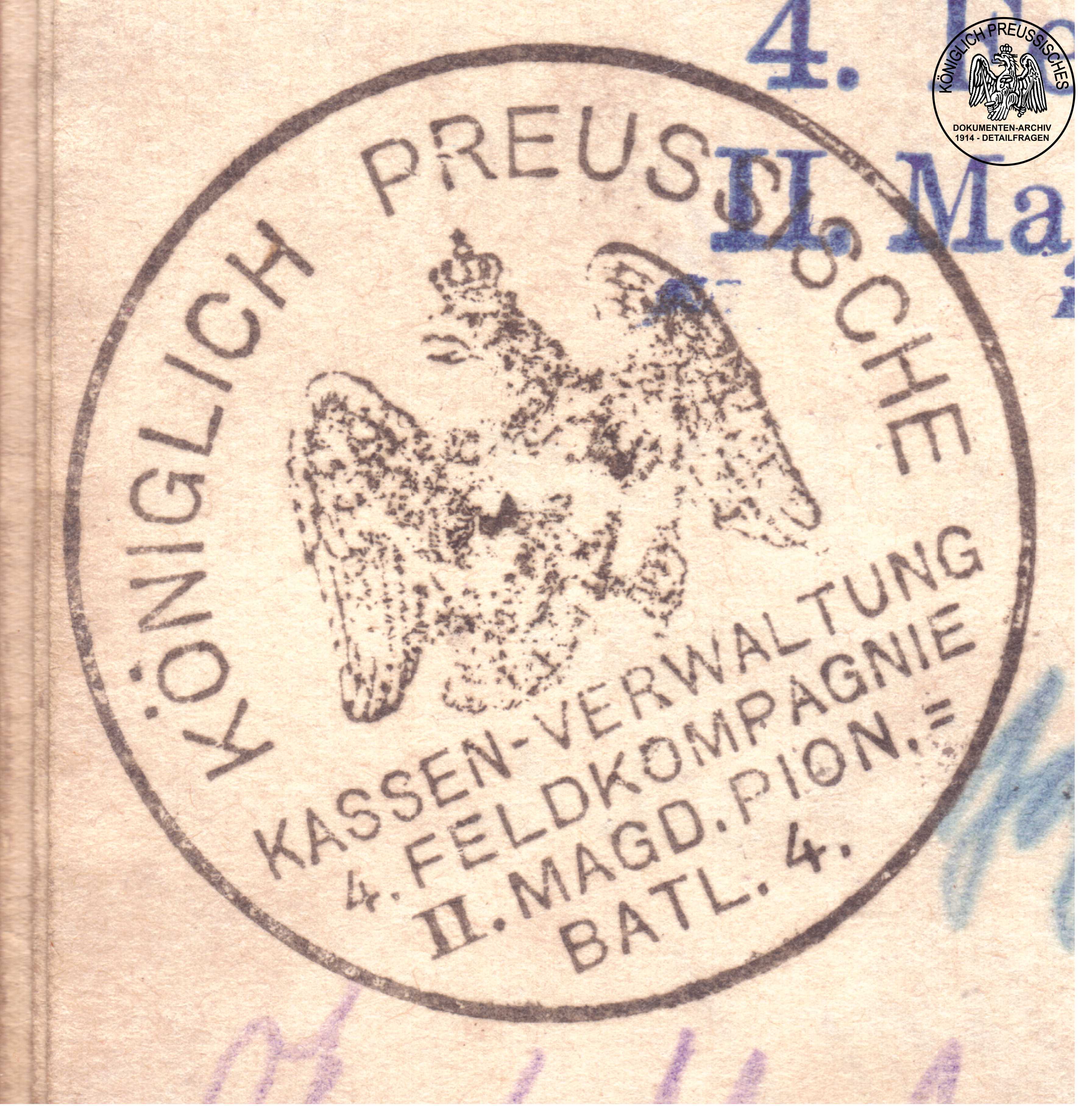 Siegel der Koeniglich Preussische Kassenverwaltung der 4. FeldkompangnieII Magdeburger Pionier Bataillion Nr. 4(aus einem Soldbuch) |